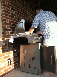 We bought the very first purchase for our new house - a gas grill! I have greatly missed the convenience of having our own grill not to mention the yummy food. I have looked forward to this sooooo much. Our new place has a gas line on the patio so we don't have to deal with propane. My sisters stopped at the store to get the fixings for burgers for dinner and Peter got to work on putting it together.