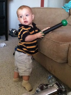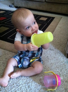 Max's sippy cup is the pink one (don't judge - there were limited color choices at the store). Landen's is the one in his hand. He quickly switched when Landen's became available, hoping to find some juice in Landen's.
