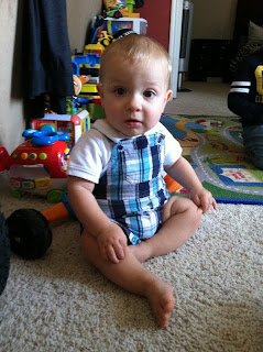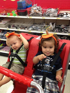 Brittany took Max and Landen shopping with her. This was Max's first time sitting in a shopping cart like this. She sent me this picture of them trying on pumpkin top headbands.