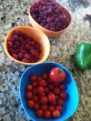 Some of the fruits of our picking labors - raspberries, cherry and big tomatoes, green peppers.