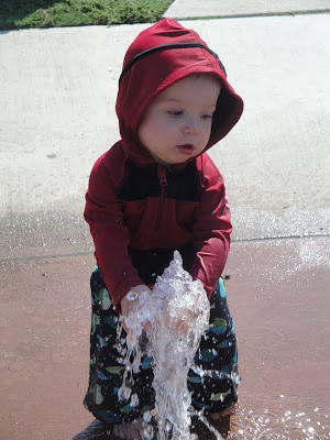 The short water fountains were his favorite but they turned on and off too much to play there for very long.