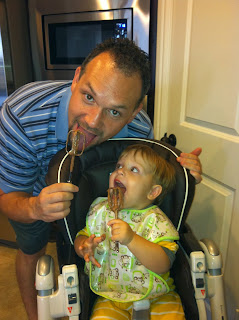 Max got lots of practice with a big boy fork. He really loved all the fruit, especially cantaloupe and pineapple.