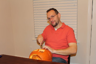 Peter carving his pumpkin.