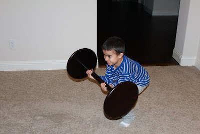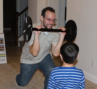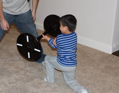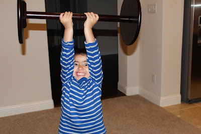 Britt and her boys came over and Peter showed Hayden how to do some weight lifting with a side table.