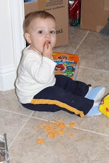 Sneaky kid knows where the snacks are. If we aren't good about keeping the pantry closed, we find things like this.