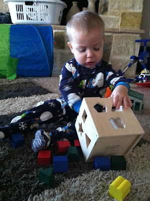 Max and his blankie first thing in the morning. When he wakes up, he stands up and calls for Peter and I. When we get close to getting him, he drops down and picks up his blanket so it comes out of the crib with him.