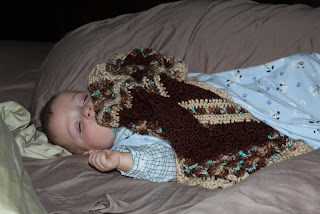 He's still fighting taking naps unless I lay down with him (which means I end up taking a nap too). He has to have his blankie in order to sleep. Thanks Aunt Aja for making this gorgeous blanket for Max!