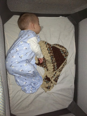 Max sleeping with his blanket. It's a MUST for bedtime now. Thanks Aunt Aja for making such a nice present for Max!