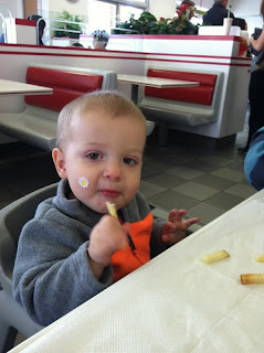 Big boy enjoying french fries and a little bit of hamburger at In-N-Out. He liked playing with the stickers.