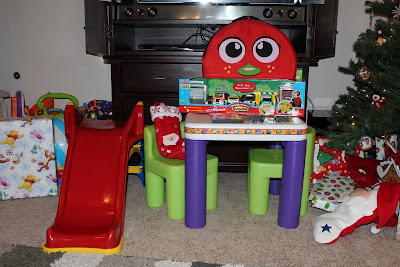 Max's toys - a slide, a table with chairs, a collapsible tunnel, some cars, and something else that I can't tell right now or remember - a movie? a puzzle?.