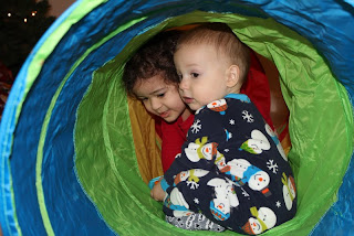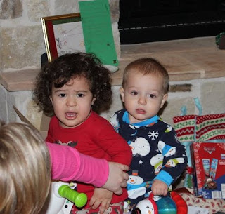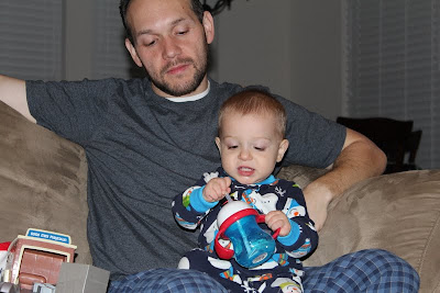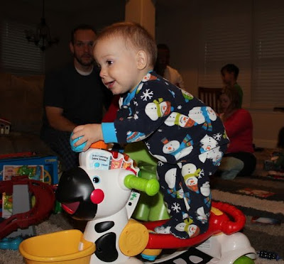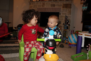Max wanted to ride Landen's toy with him. Landen wasn't so happy about it. (Notice Max is holding his cup. We put a little orange juice and water in it and he rarely set it down the rest of the morning.)