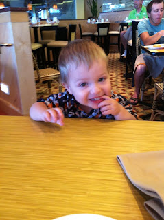 Breakfast at the hotel. He was super cute. I think everyone around us was entertained.