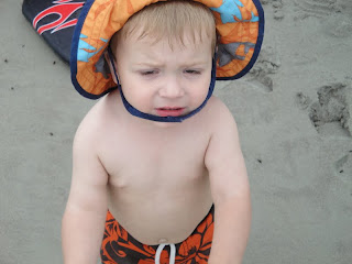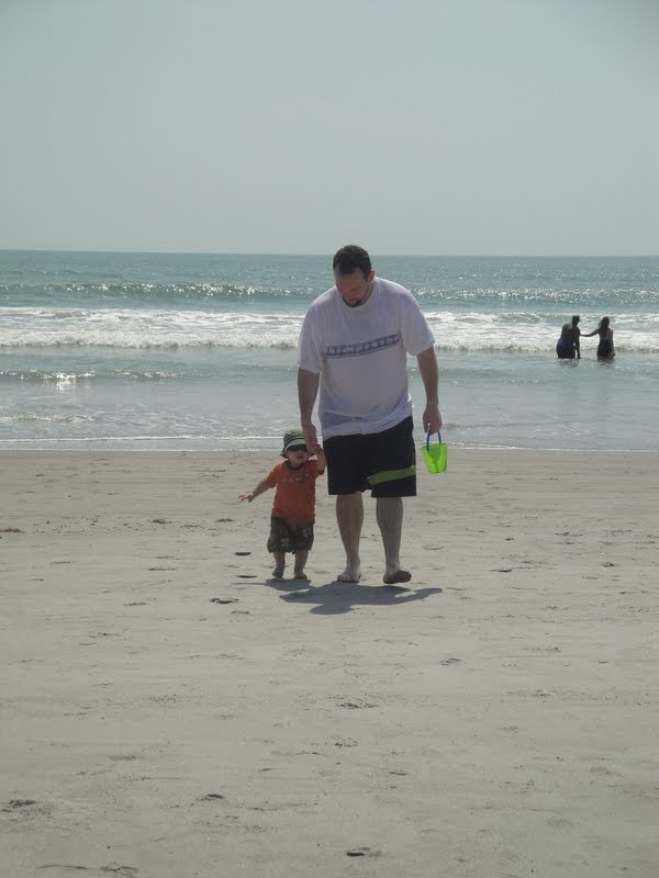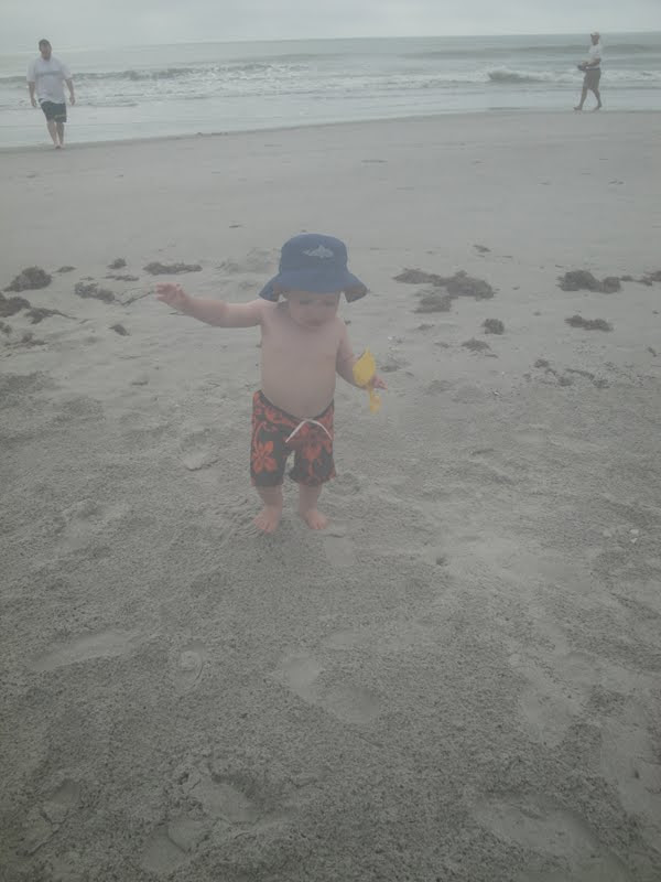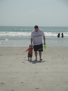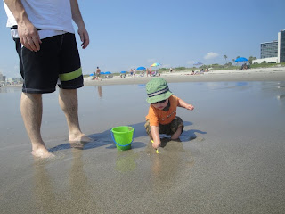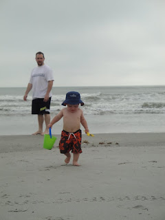 Max still didn't want to walk on the sand. He was okay where it was firmer out by the ocean but further up the beach where it wasn't as compacted, he really didn't like. BUT at this point he had fully warmed up to playing in the sand and the ocean and was loving it. We took him out in the waves a few times. Peter took him further out than I did...it made me nervous. And after one big wave came that required Peter to lift Max over his head to ensure he stayed above water, Peter decided to move closer to the shore.