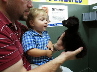 We took a break from all the gardening and took Max to a pet shop. I thought he would really enjoy playing with the puppies and the other animals. We started with a little puppy. He looked at it but when he petted the puppy he was a little rough so we decided to try playing with a bigger puppy.