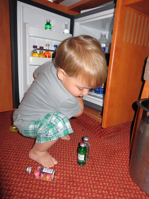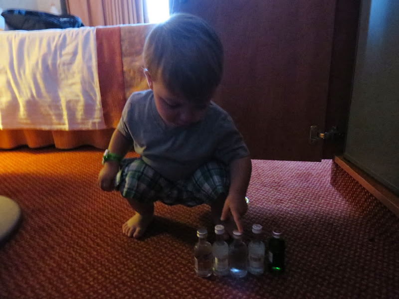 Remember how I said I didn't bring many toys? Well, when you are desperate, nearly everything can be a toy...even the small liquor bottles they put in your fridge.