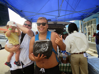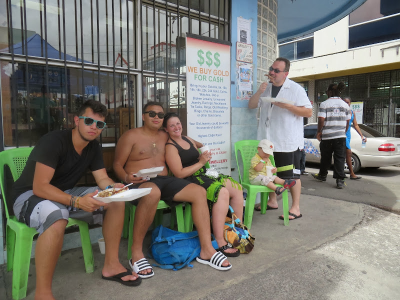 Once we got back to port, we decided we wanted to go find some local food and explore the area. So we walked around and ran into some Canadian college students that were on the catamaran with us. We tried to ask some locals where to eat but their accent was so thick, we just couldn't understand. After walking for a bit we came across this sort of Caribbean food truck. This guy, in full chef gear, was basically cooking out of the back of a van. He had a full grill and burners set up on some picnic tables and the place was hopping with customers. We decided to go for it! He had stuff like steak, fettuccine alfredo, and BBQ chicken on the menu. It was just crazy.