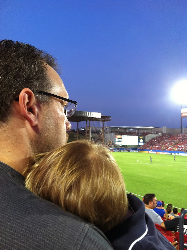 We went to another FC Dallas game. Max kept saying he didn't want to go to the soccer game (which he has never said!) and as we got closer he refused to walk and we had to carry him. He kept talking about not wanting to see the fireworks. He clearly was remembering the 4th of July. It was a night game so it was past his bed time and he was not too happy. The boy behind us had a loud horn and blew it once which freaked Max out and after that he had no interest in the game. He only wanted to cuddle with his daddy. :(